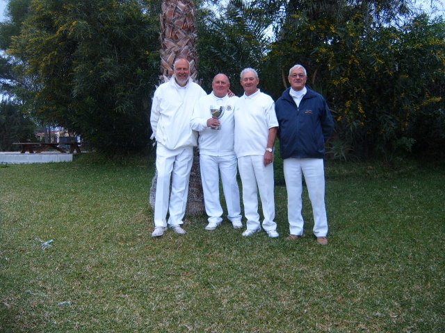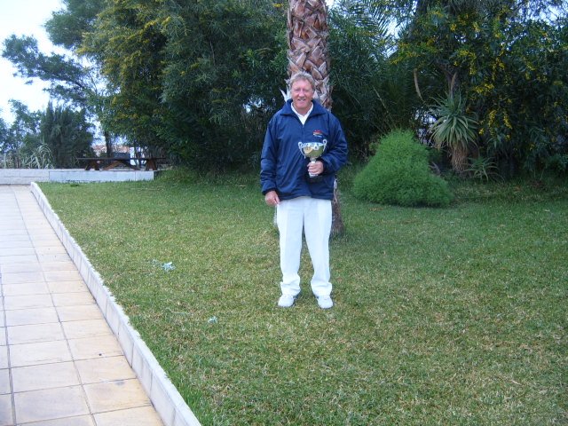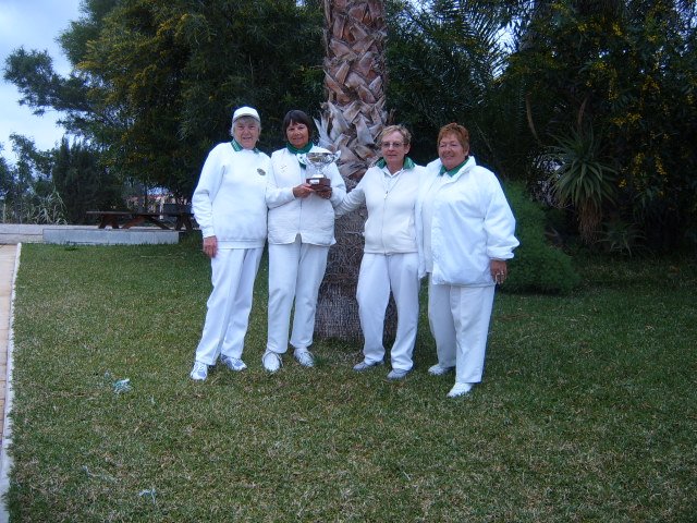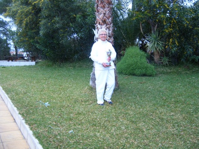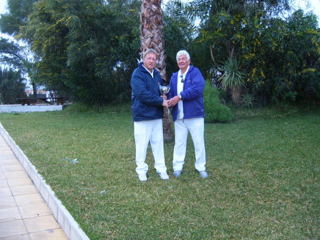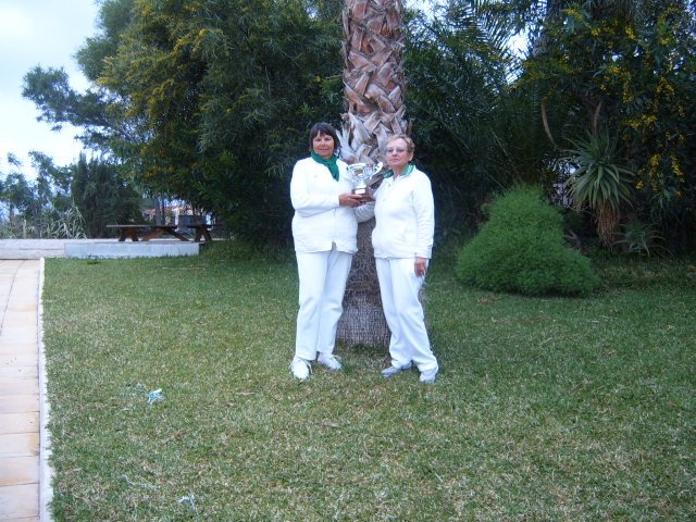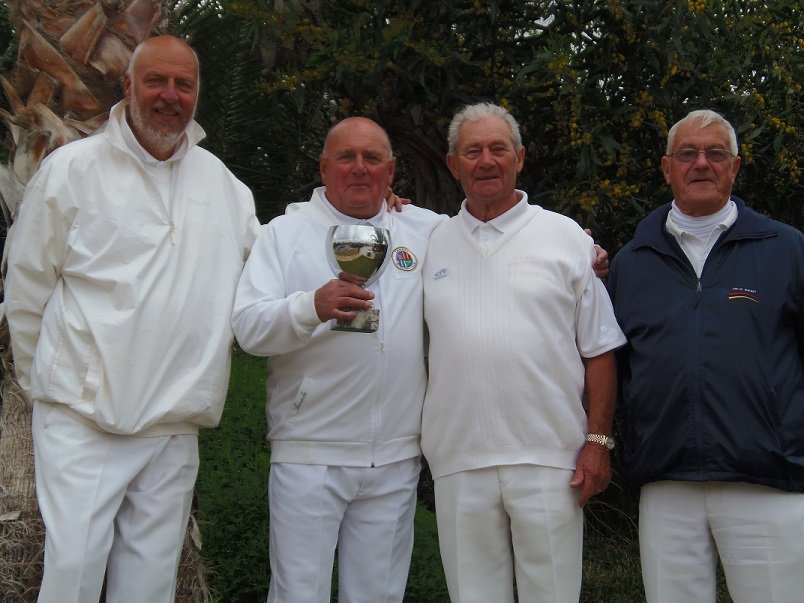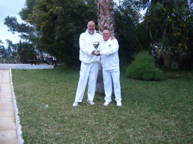 On Thursday 19th March the CALB Men and Ladies Singles Finals took place at Almeria Bowling Club. This competition began in December 2014 and involved over one hundred and thirty players from bowling clubs, Almeria (ABC) Cabrera (CAB) and Indalo. (IND) Mojacar (MOJ) In the morning the Singles took place on a miserable rainy day with everyone getting very cold and wet, including the ‘willing’ markers, yours truly, Jim Pike and Umpire, David Jenkins. The afternoon was very dark and cloudy with the occasional sprinkling of rain when the Men and Ladies Pairs took place. The results were as follows: