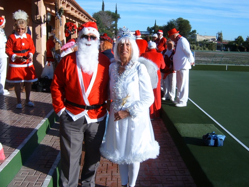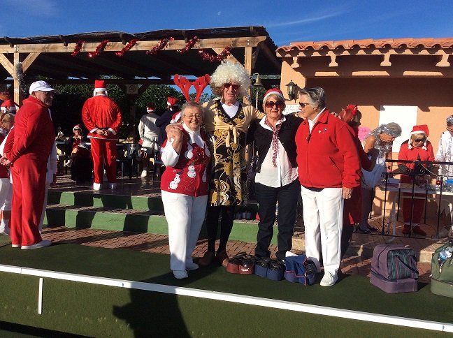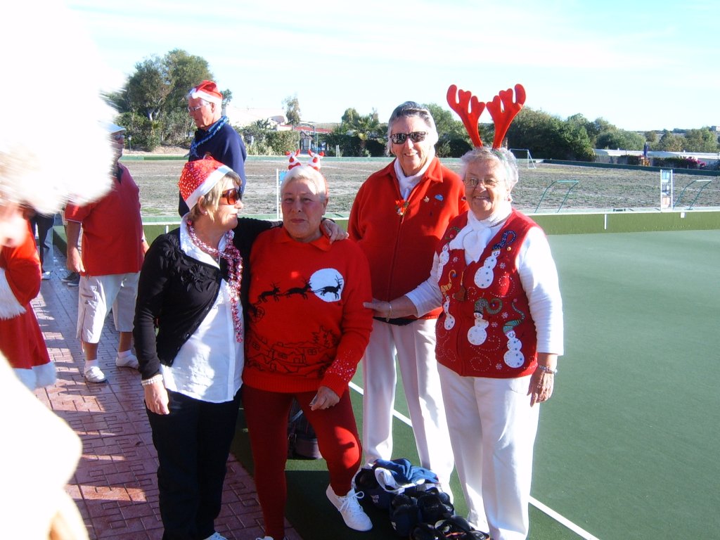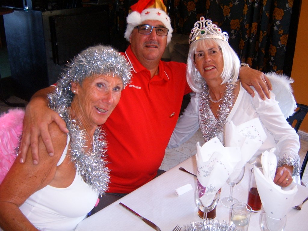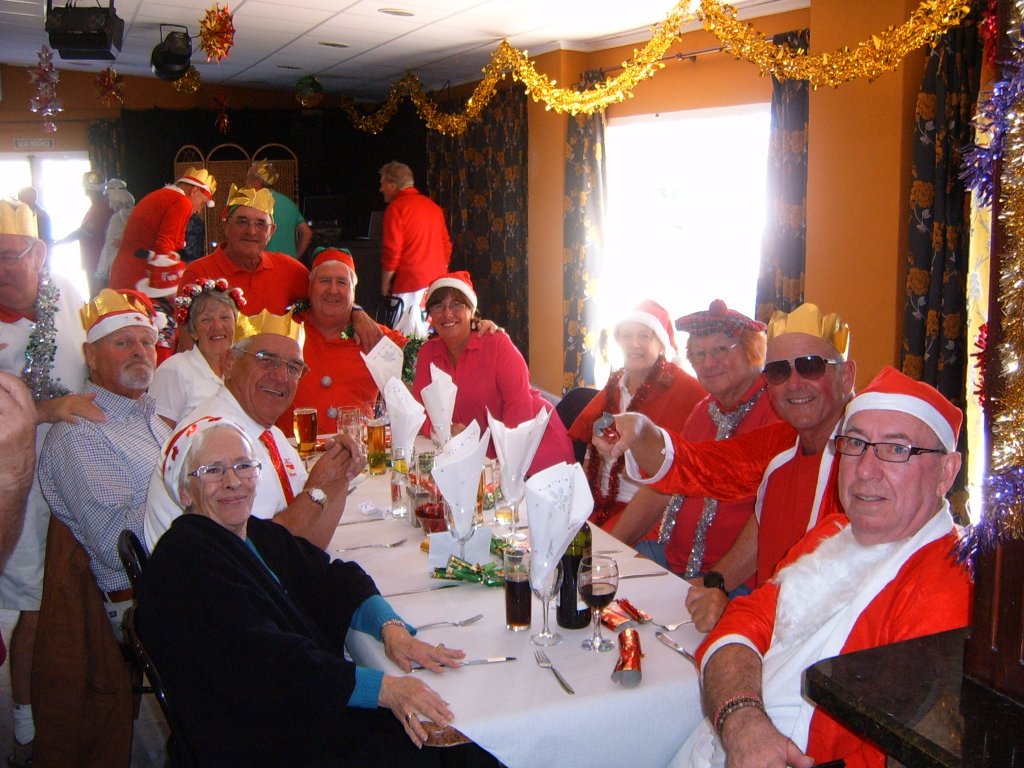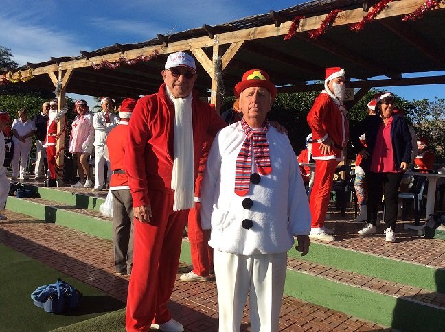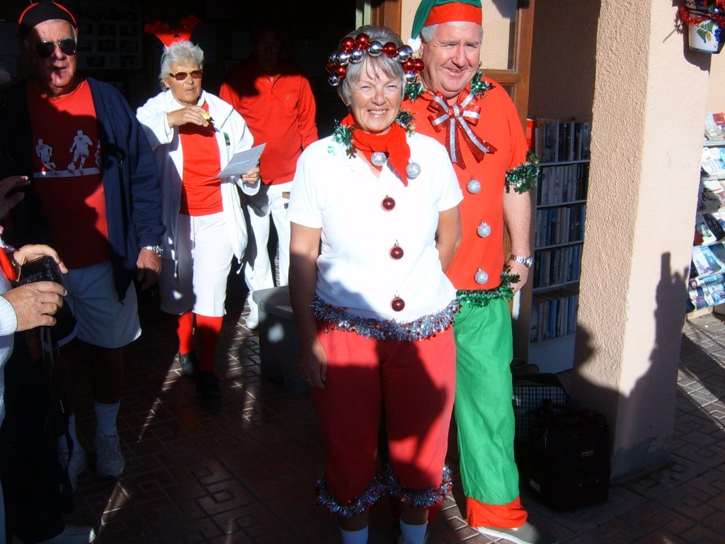 Most members were dressed traditionally in Christmas attire and thoroughly enjoyed their game. A ‘Spider’ was played where Pat Deacon won a bottle of Brandy. During this Dot Lloyd and friend judged the members for the best fancy dress. Sandra Brown presented prizes to the winning lady, Julie John with Catherine Patrick coming in second place, both dressed as fairies. Stuart Beetham was the best man with John Burgess coming second. After bowls everyone retired to the Miraflores Patio for refreshments prior to the Christmas Lunch. As usual the Carvery was excellent and the sweet just as good.