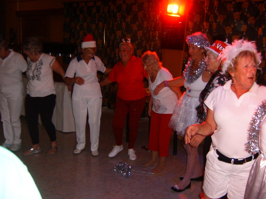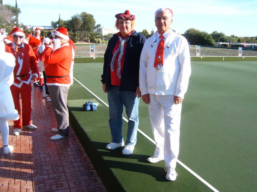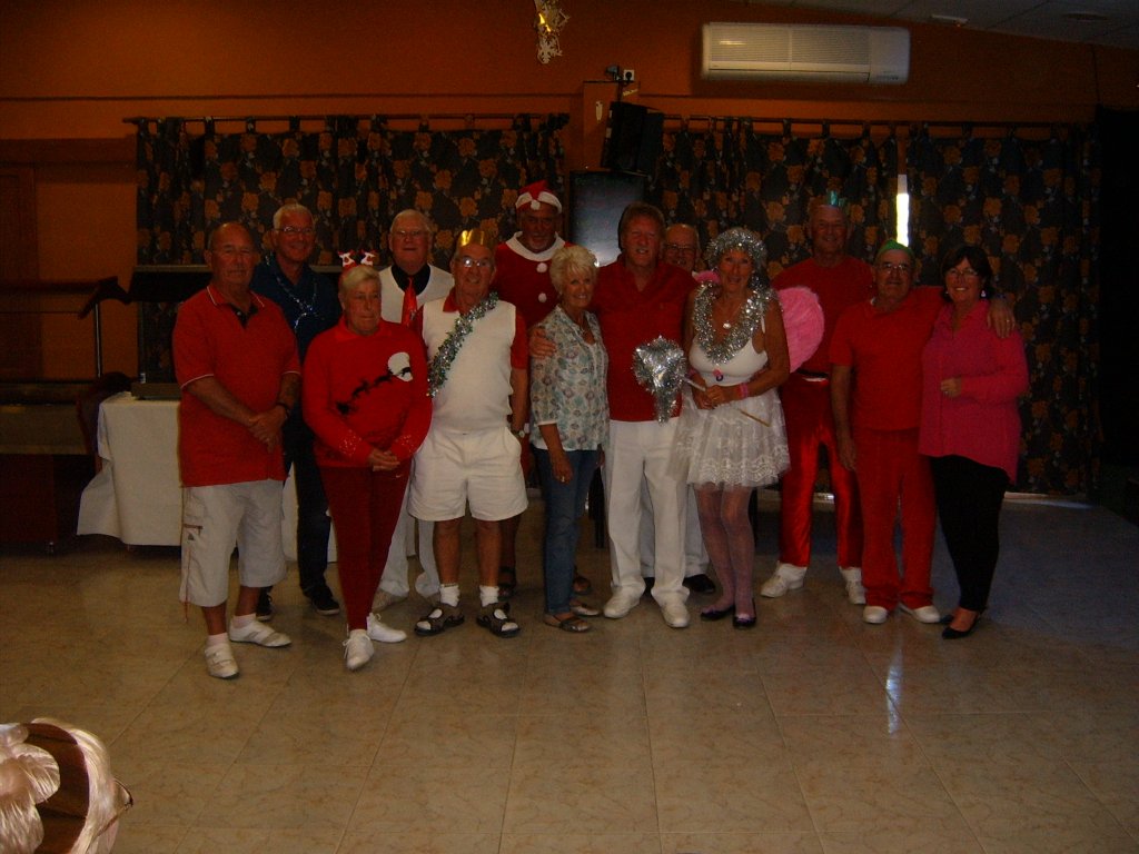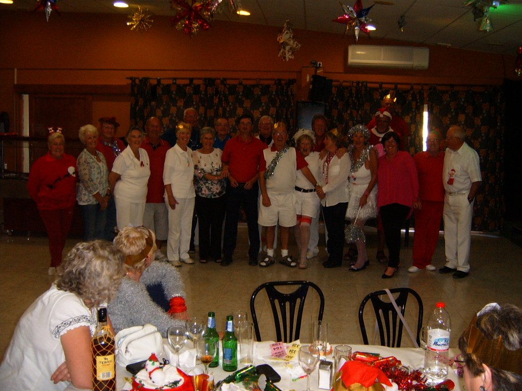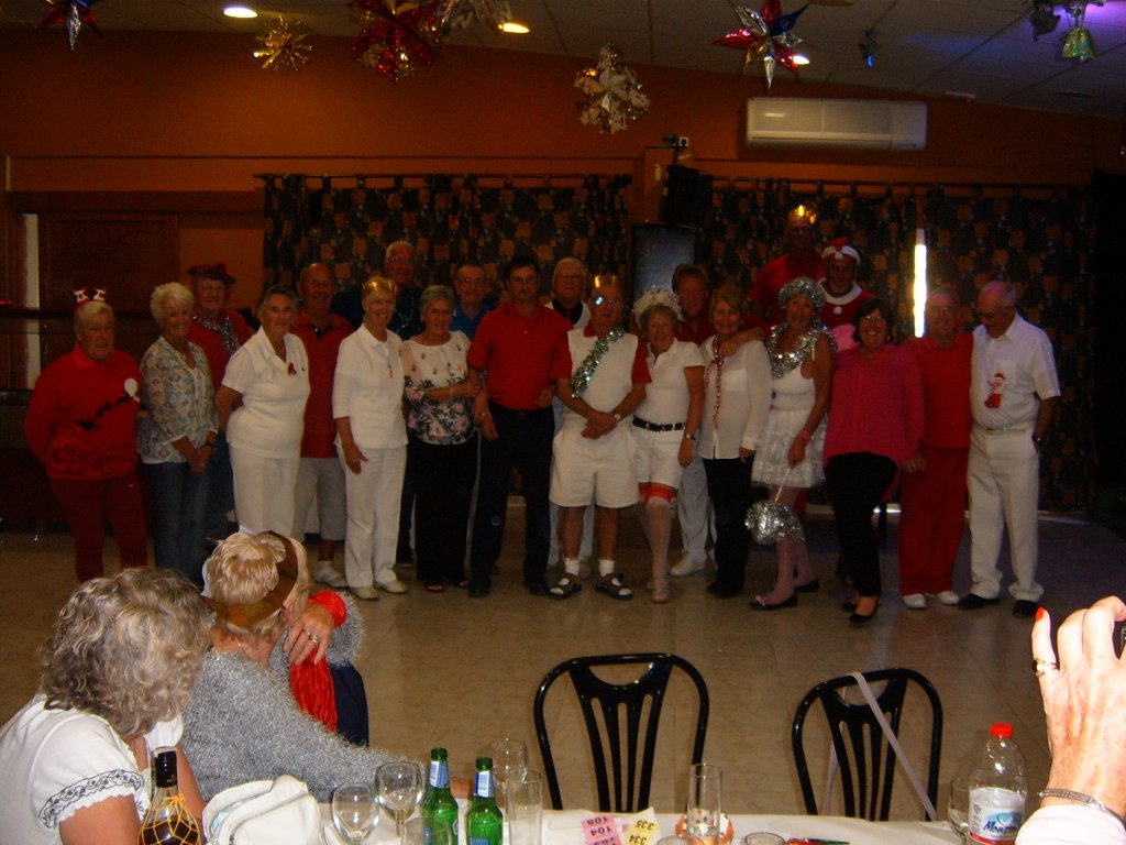 Whilst this was being sorted our Captain addressed the audience and thanked all those members who had made a difference during the year to make it the successful club it now is. These included Sandra Brown for her superb management of in arranging this party. Eileen Phoenix and co for running the raffle, Jim Pike and helpers, Graham and Catherine Patrick plus helpers for Christmas decorating the patio area. Ron Lloyd and Brian Hughes for the carpet and equipment management. Graham Patrick and Tony Mullen and helpers for the new steps on to the greens and carpet laying. Stuart Beetham for his hard work on making our fixture program operating well, despite dealing with problematic situations. He also thanked the Miraflores staff for looking after us and presented a healthy money collection from us to them to be shared by all the staff. Finally yours truly for my work in making our club competitions operate correctly. He then handed over to me to start the presentations of prizes.