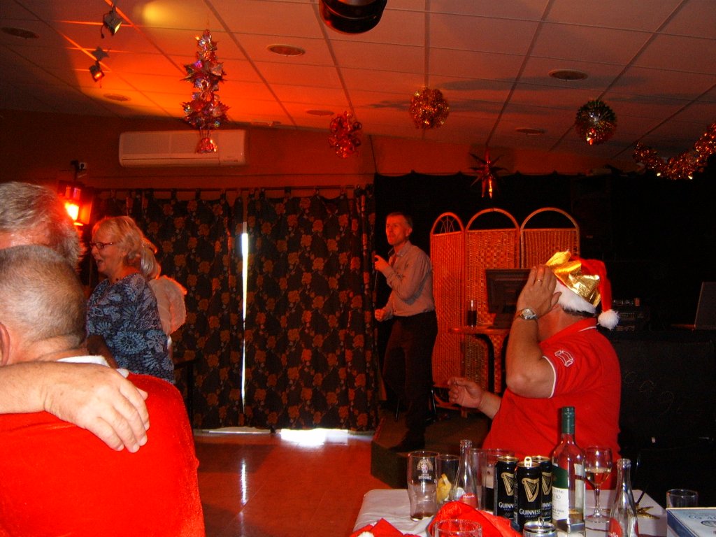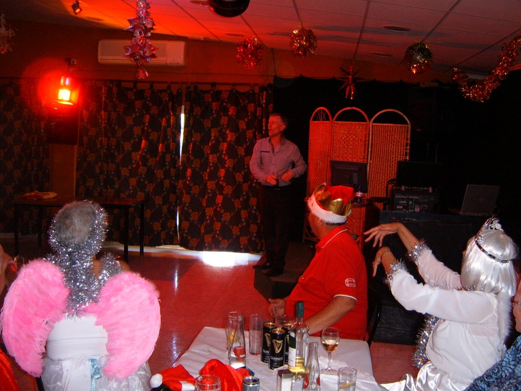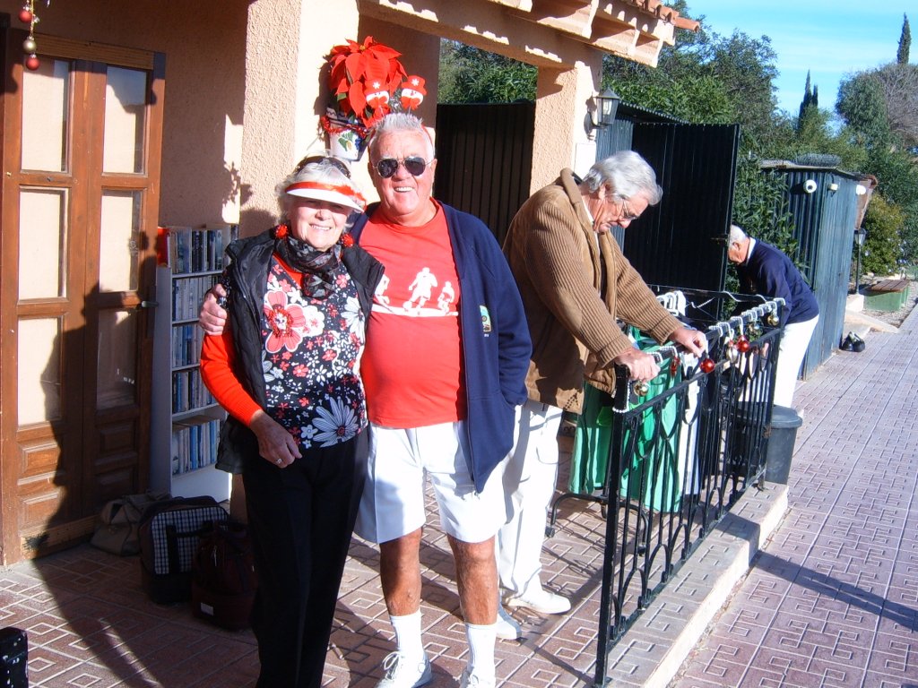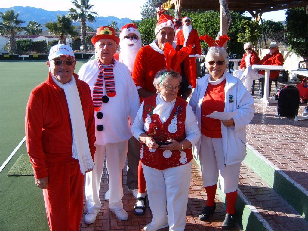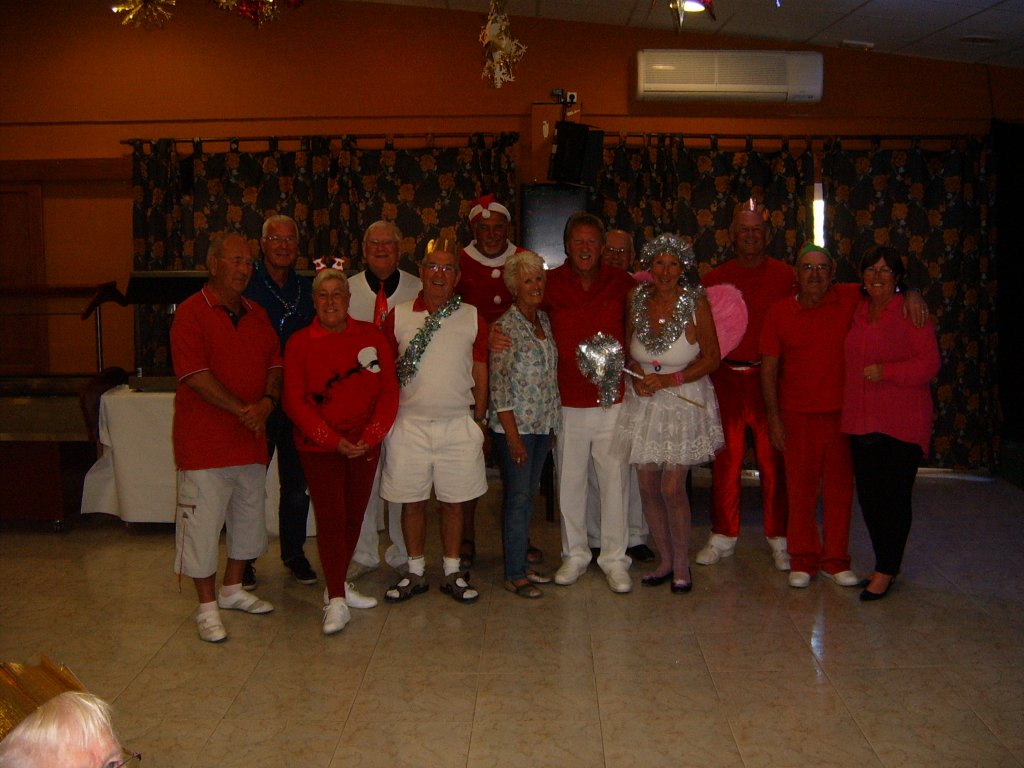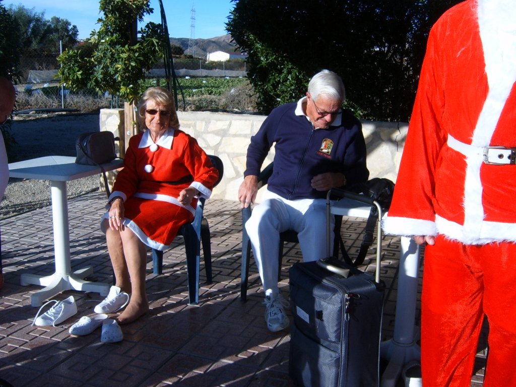 Whilst this was being sorted our Captain addressed the audience and thanked all those members who had made a difference during the year to make it the successful club it now is. These included Sandra Brown for her superb management of in arranging this party. Eileen Phoenix and co for running the raffle, Jim Pike and helpers, Graham and Catherine Patrick plus helpers for Christmas decorating the patio area. Ron Lloyd and Brian Hughes for the carpet and equipment management. Graham Patrick and Tony Mullen and helpers for the new steps on to the greens and carpet laying. Stuart Beetham for his hard work on making our fixture program operating well, despite dealing with problematic situations. He also thanked the Miraflores staff for looking after us and presented a healthy money collection from us to them to be shared by all the staff. Finally yours truly for my work in making our club competitions operate correctly. He then handed over to me to start the presentations of prizes.